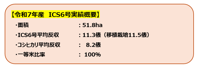 令和7年産の「幸の栖(さちのすみか)」の平均収量は11.3俵/10a(最高反収は12.7俵)と、同年・同生産者間におけるコシヒカリの平均収量8.2俵/10aと比べても非常に高くなっております。コシヒカリの平均反収が昨年比減少する中、幸の栖はコシヒカリ比+2~4俵/10aの増収結果となりました!